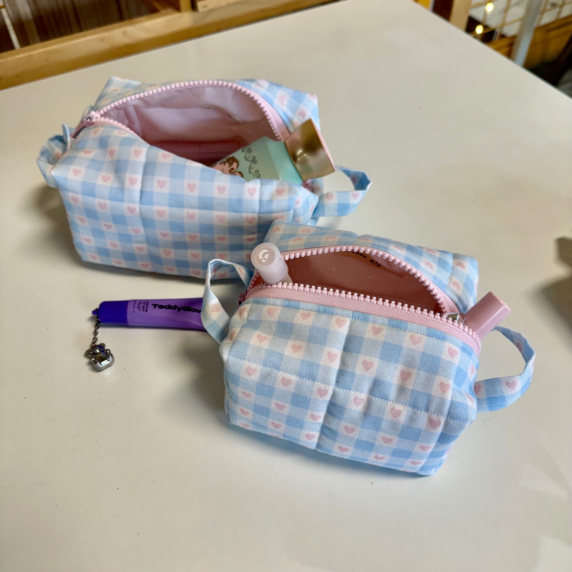 This one features a From Aly fabric design with light blue gingham and light pink hears!